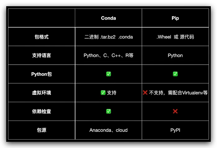 但是 conda 中包的数量远不及 pip 包的数量,所以对于一些冷门的资源,可能还是需要使用 pip。