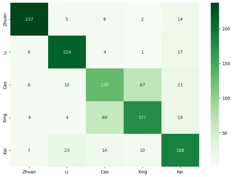 横向表示真实标签,纵向表示测试样本得到的标签。例如第一行第一列的237,表示在篆书的测试样本中,有237个被识别为了篆书。即对角线的绿色越深,其他色块颜色越浅,识别的准确率越高。