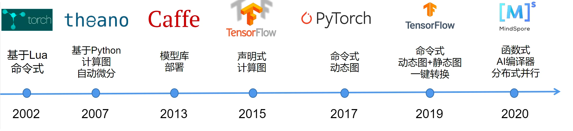 早年诞生的机器学习框架有着这那的不足和兼容问题,许多公司开发人员和大学研究人员开始从头设计和实现针对机器学习的软件框架。在短短数年间,机器学习框架如雨后春笋般出现(较为知名的例子包括TensorFlow、PyTorch、MindSpore、MXNet、PaddlePaddle、OneFlow、CNTK等),极大推进了人工智能在上下游产业中的发展。