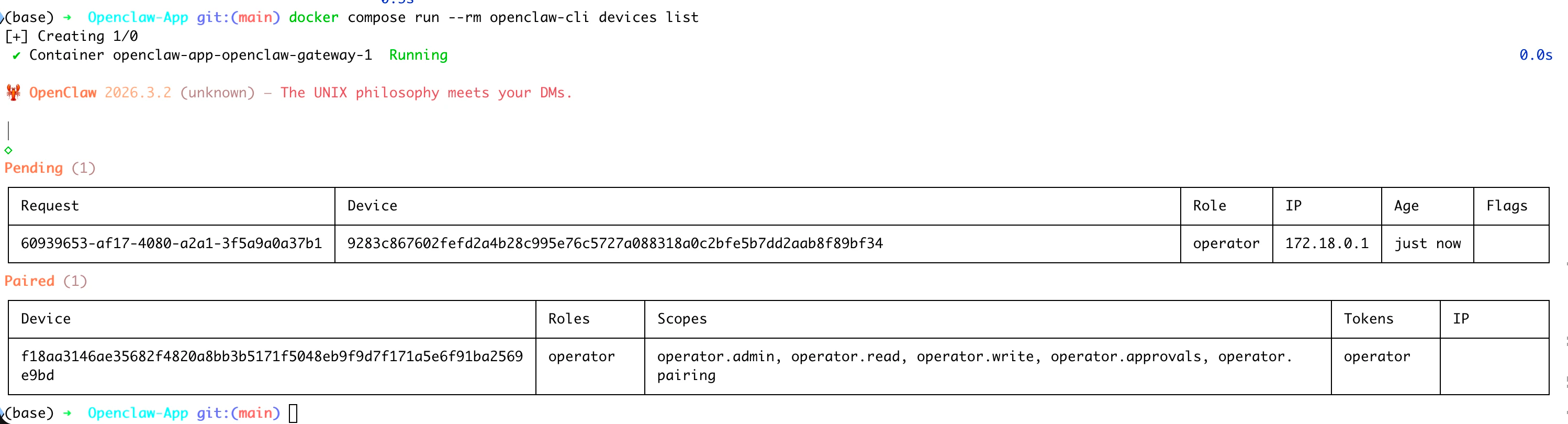 docker compose run --rm openclaw-cli devices list