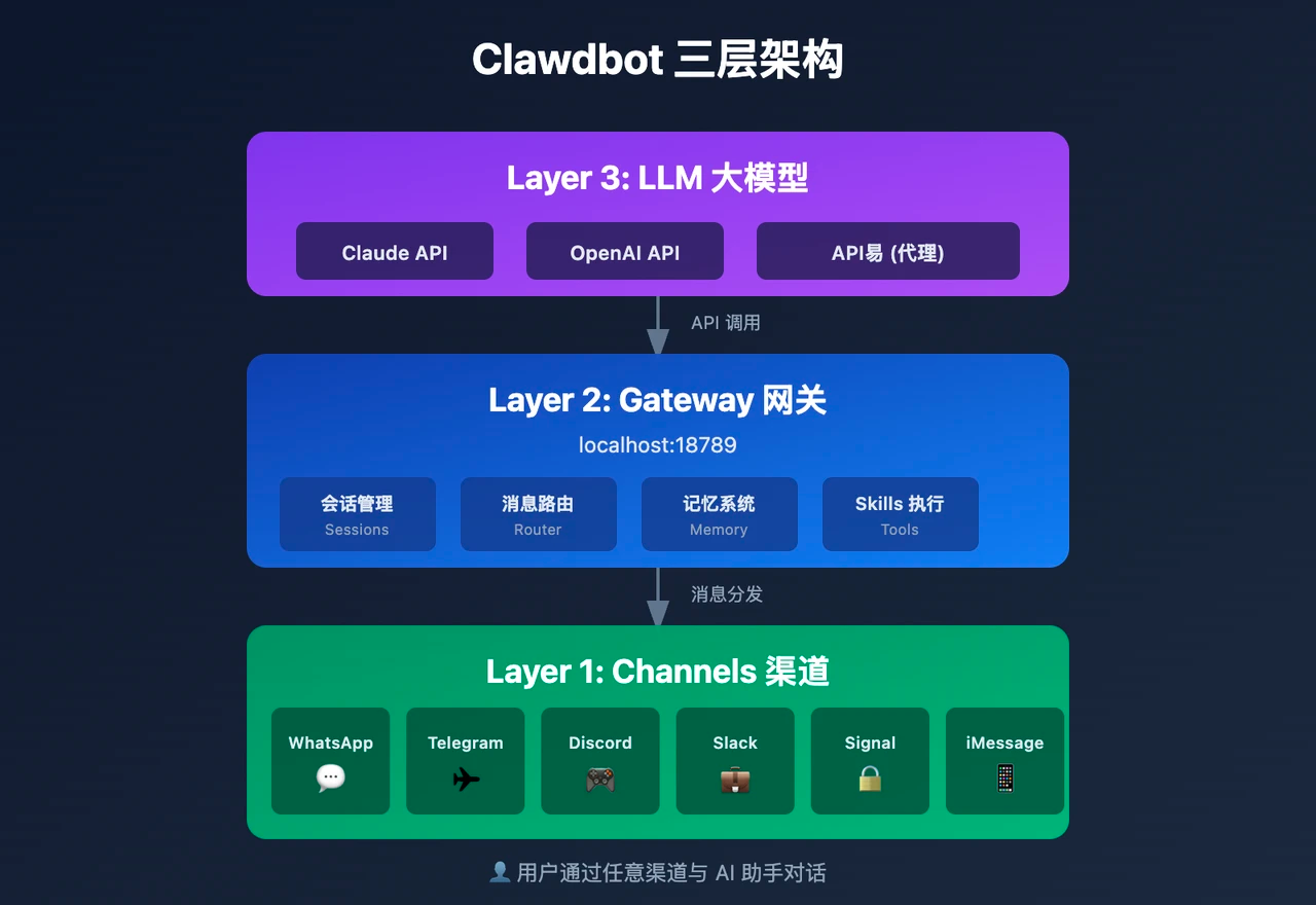 Gateway是Clawd系统的核心心脏,是一个基于Node.js(要求v22+)构建的长运行守护进程。它充当了所有外部通信与内部逻辑之间的总线。