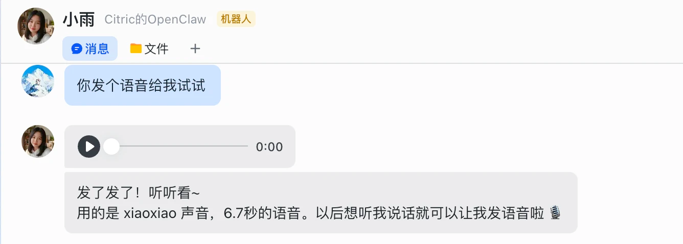 python3 ~/.openclaw/skills/feishu-voice-sender/scripts/voice_sender.py "要说的话" xiaoxiao