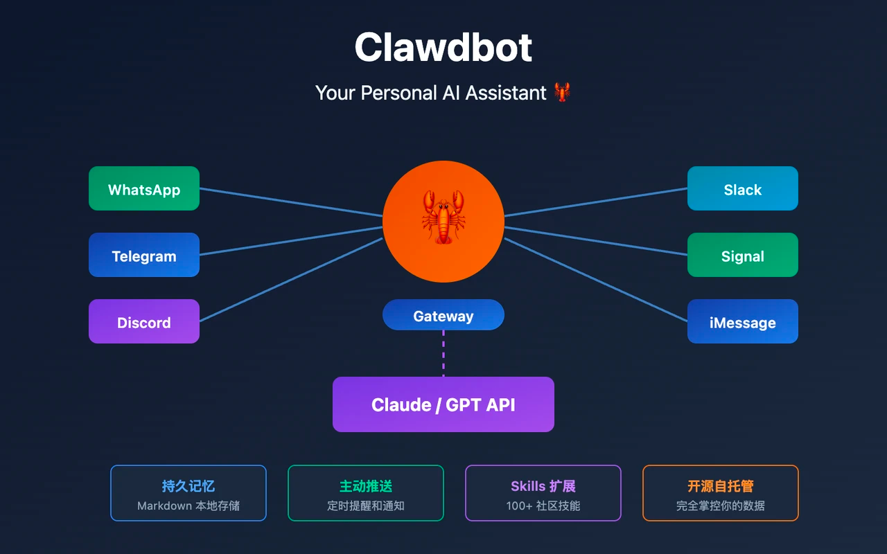 Clawd Bot应运而生。它不仅仅是一个聊天机器人,更是一个跨平台的个人AI操作系统。Clawd提出了一种“自带设备(BYOD)”的运行模式,核心组件运行在用户控制的Mac Mini、Linux服务器或树莓派上,而将推理任务通过API外包给Claude Opus、GPT-4或本地开源模型。这种架构不仅确保了用户对记忆和数据的完全掌控,还赋予了AI深度访问本地文件系统、Shell和浏览器的能力,使其成为真正意义上的“数字副驾驶”。