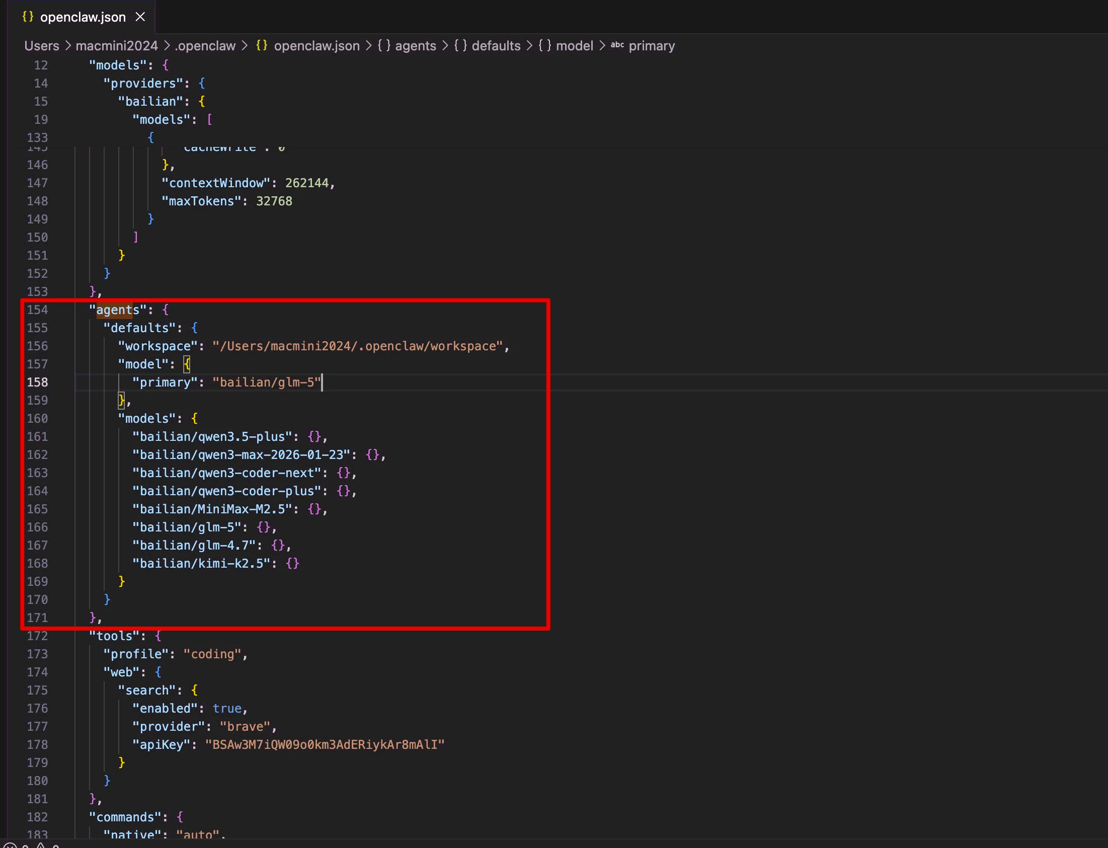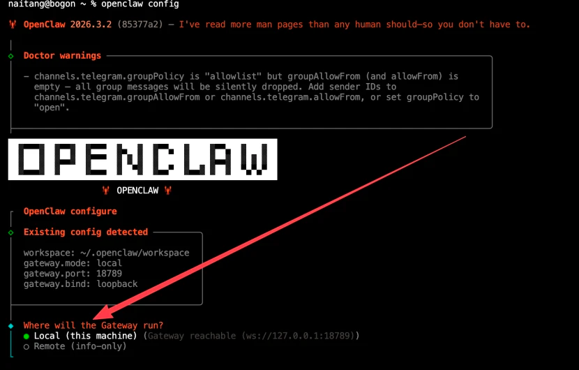 在终端中执行这行命令,打开 OpenClaw 的程序配置文件: