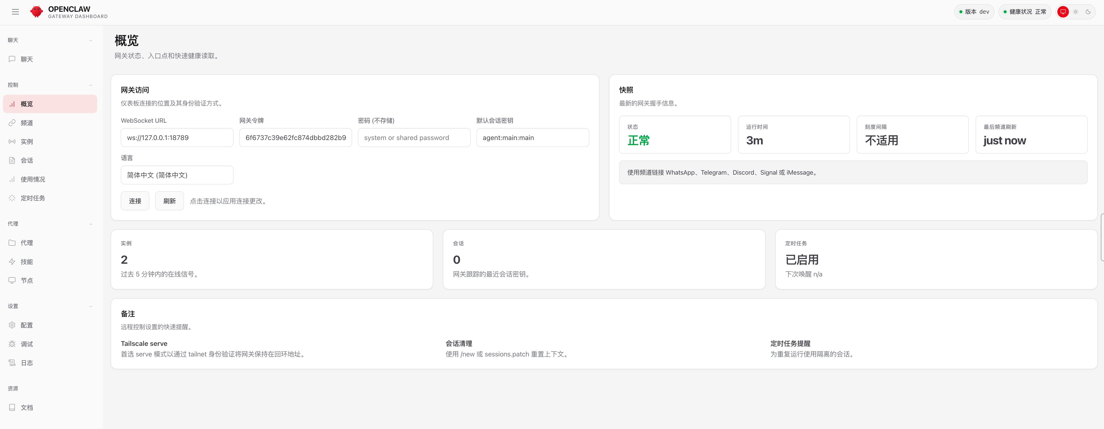现在,你在网页就能看到健康状态应该是正常的了,这时候才意味着OpenClaw在Docker顺利安装完成。可以开始使用了。