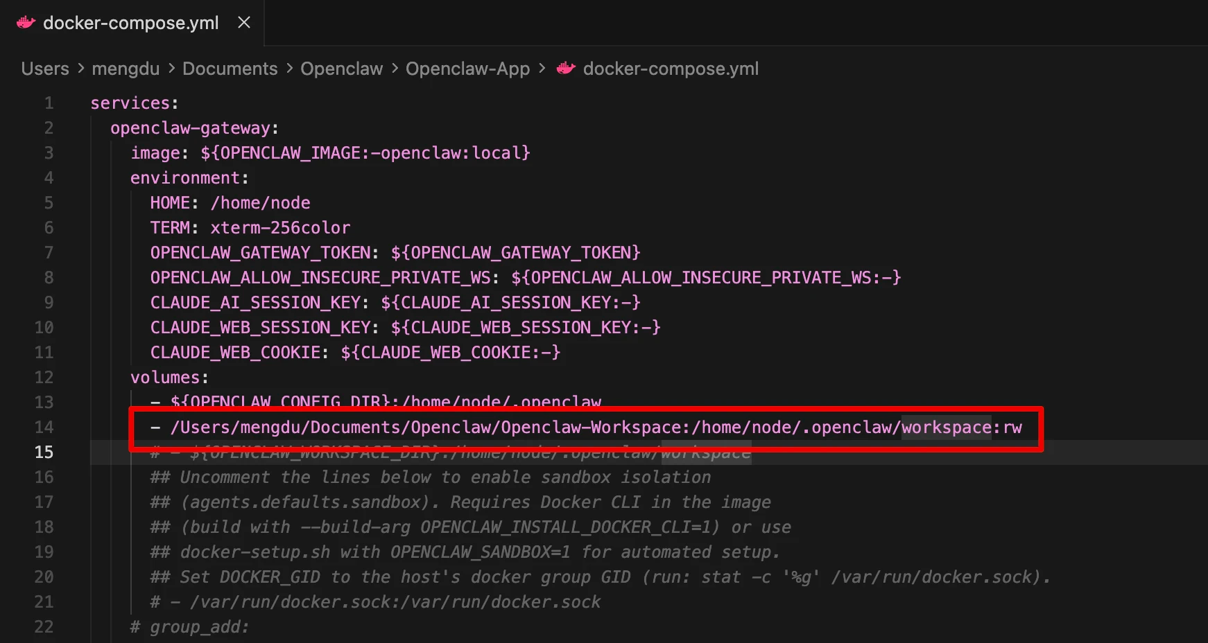 open -e ~/OpenClaw-App/docker-compose.ymlOpenClaw 官方设定的沙盒内部路径就是: /home/node/.openclaw/workspace