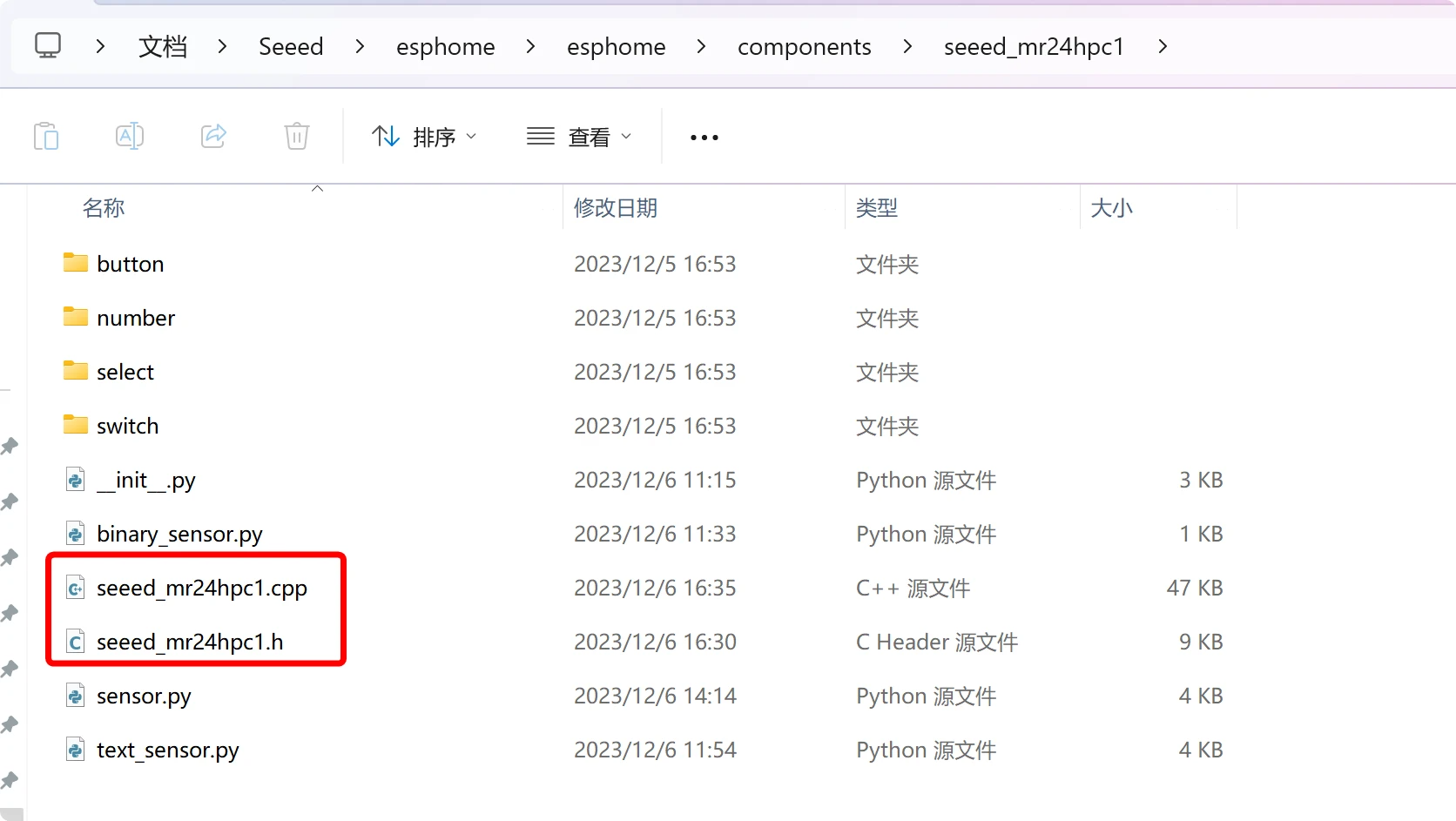 例如现在要写mmwave kit 的 seeed_mr24hpc1 的外部组件,那么文件目录初步规划至少是: