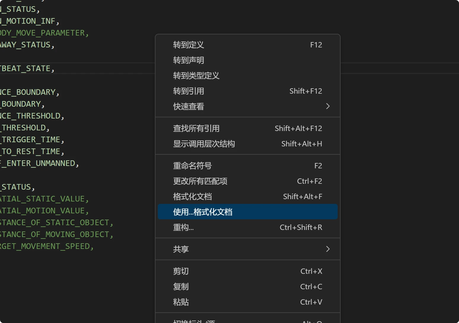您可以使用“设置文档格式”(Shift+Alt+F) 设置整个文件的格式,也可以使用右键单击上下文菜单中的“设置所选内容格式”(Ctrl+K、Ctrl+F) 仅设置当前选择的格式。